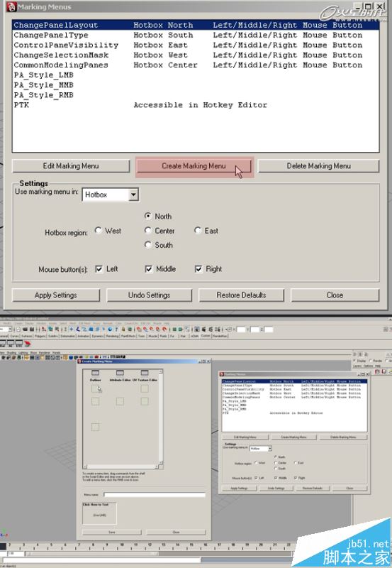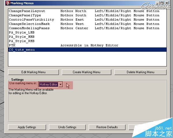 第7步、我希望能够有一个热键来调用我们的新菜单,选择Use marking menu从下拉菜单选择Hotkey Editor。现在,点击应用设置并关闭窗口。我的菜单现已完成,只需要一个使用它的方式!