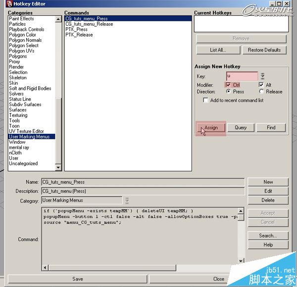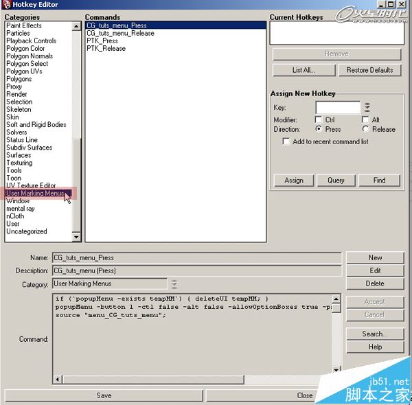 第9步、从左侧类别列表中选择User Marking Menus,然后选择右边刚刚做好的自定义标记菜单。