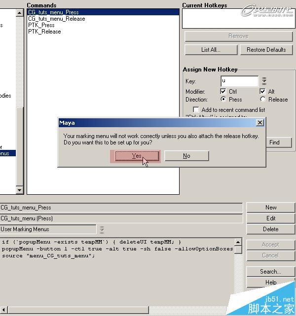 第11步、在弹出的对话框中单击Yes,这将确保我们的标记菜单将正确的使用。