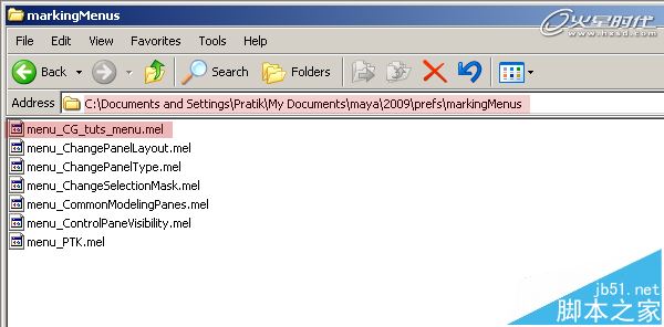 第13步、如果你想在另一台机器上使用这个标记菜单,你可以将生成的标记菜单文件复制到另一台机器上,标记菜单文件夹默认路径是:C:\Documents and Settings\用户名\My Documents\maya\2009\prefs\markingMenus
