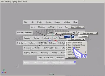 使用默认配置的热键箱时,要立即打开所有的菜单组 ( 如 Modeling 、 Rendering 等 ) ,可以选择 Hotbox Controls → Show All 命令,如图 2-3 所示。
