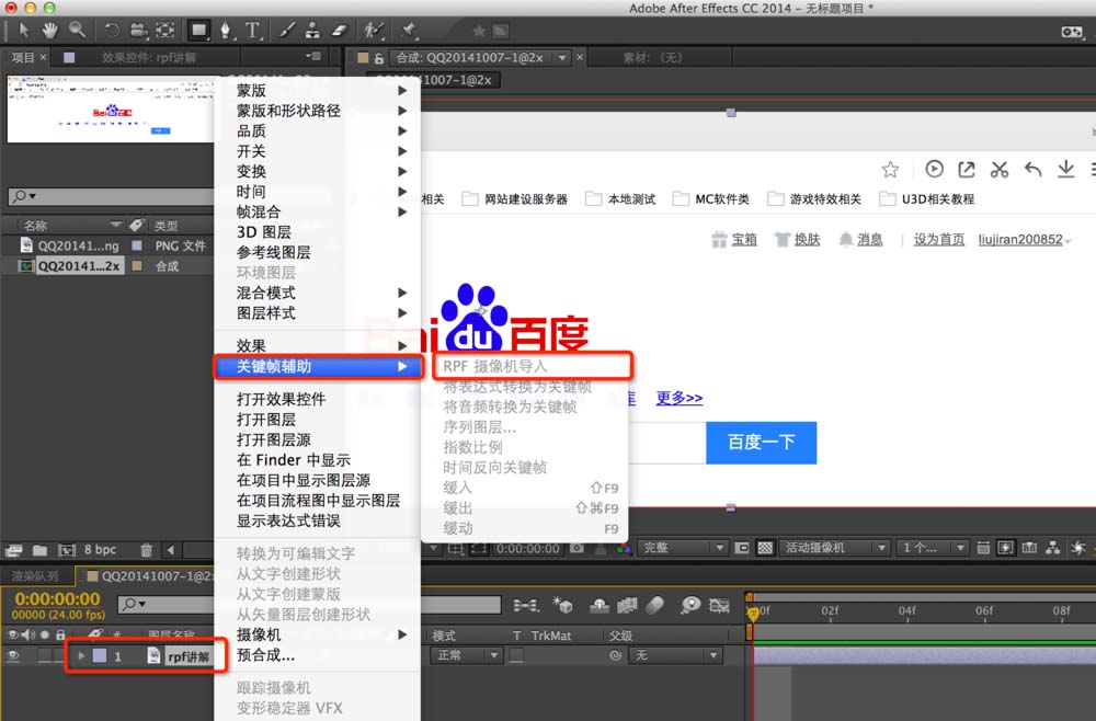 第三步:如果你得到了一组Rpf序列,想得到它里面信息数据,你打开AE,导入之后,看下图框内指示(小编暂无rpf文件,暂用其他图片做演示用,不过不影响案例讲解)在RPF文件层上,右键,关键帧辅助,RPF摄像机导入,恭喜你摄像机一步导入,执行完这一步之后,就会在窗口出现一个摄像机层,一步就简单提取出来三维软件中摄像机信息作为ae中摄像机使用