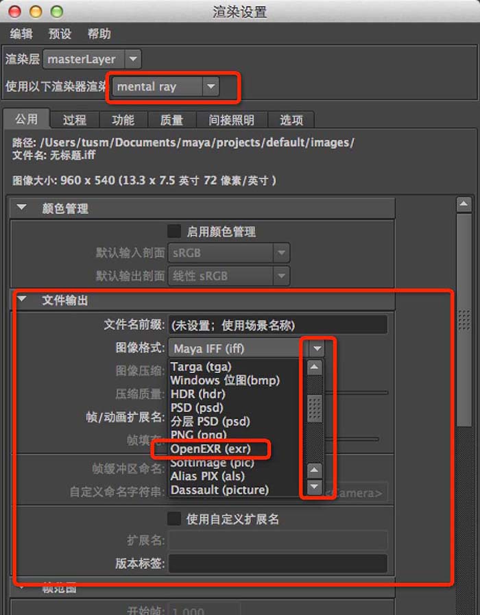 第五步:大家看到了吧,maya切换mental ray渲染器,得到众多输出格式,那么有没有一种格式和max的RPF格式相近,包含很多信息呢?有!就是上图框出来的格式,exr格式,配合maya的mental ray分层渲染,这种格式包含的数据非常的丰富。