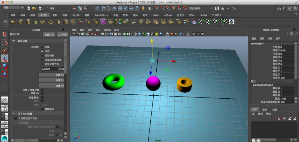 第七步:打开maya,设置首选项,改单位厘米为毫米单位,创建几个基本几何体在场景中,位置可随意摆放,上材质,给不同颜色,打一盏点光源,灯光属性面板中,阴影,勾选光线追踪,产生投影,这些是maya基础操作,不再多赘述。