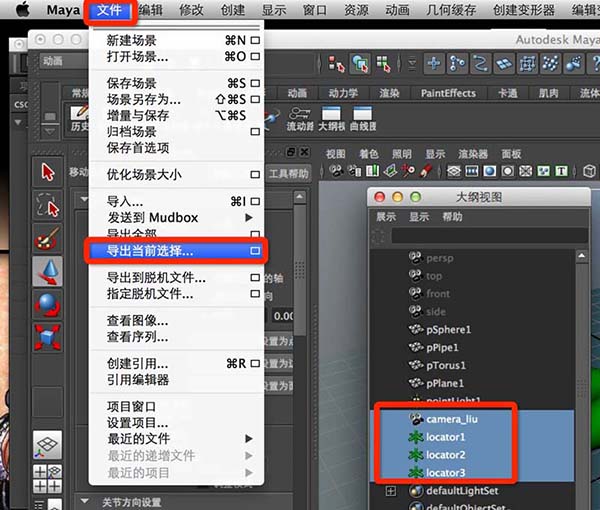 第十步:选中摄像机,烘焙摄像机的关键帧,在大纲视图选中摄像机和三个定位器,导出ma格式,这里是一个很重要的知识点,AE支持maya的ma文件!听到这里是不是很激动,ae能读取maya的ma文件中的摄像机信息,此时你还为maya不能导出rpf文件,无法实现相机参数共享而发愁吗?那你高兴的太早了,再告诉你一个更激动的知识点,ae不仅能支持maya的ma文件相机参数的读取,它还能读取maya定位器的位置信息,转换为ae中的空层,这是一个重中之重的知识点,因为即使你把ma的相机参数在ae中实现共享数据,但你却找不到一个给实拍素材的立足点,换句话说,即使同一个相机,输出的同一个场景,你添加的素材却还是不跟随原始相机和场景一起“和谐逼真”的运动。