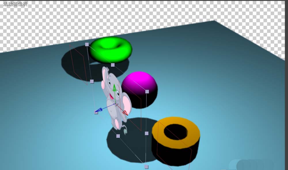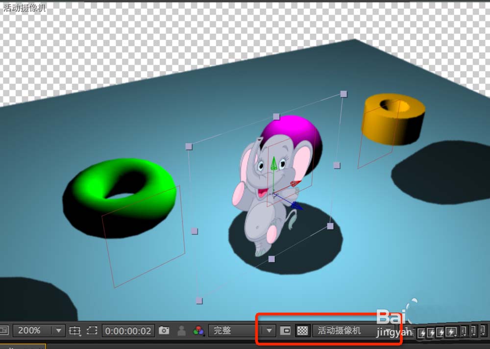 第十二步:再导入一张素材图片,可百度图片搜索,只为案例讲解,导入到ae中后,打开它三维开关,摄像机视角切换为下图自定义模式,使用视角调整工具观看合成窗口效果,移动素材的xyz轴向到参考定位的三个空层附近,完工之后,切换到活动摄像机,此时播放,你会发现神奇的事情发生了,相机拍摄的小象的视角效果完美的和周围融合了,