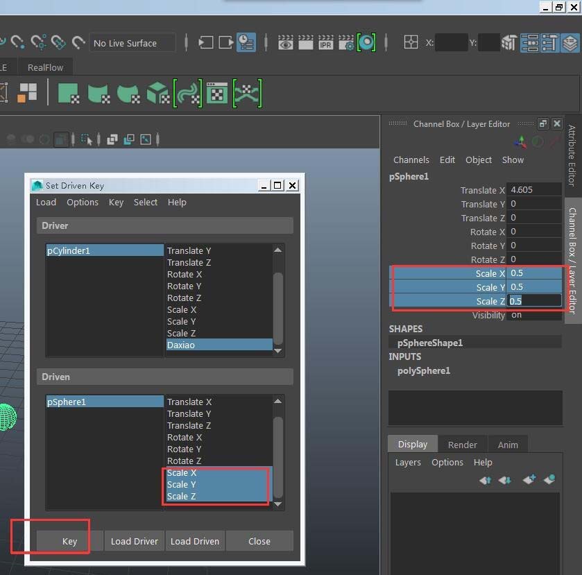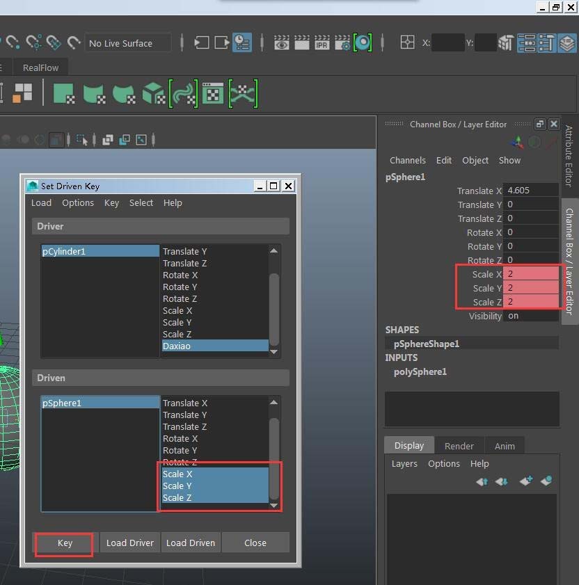 7、选中driver中的属性调节最大数值,然后对应到driven的属性数值,点击key