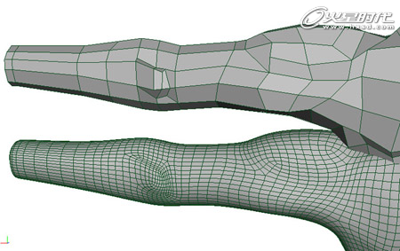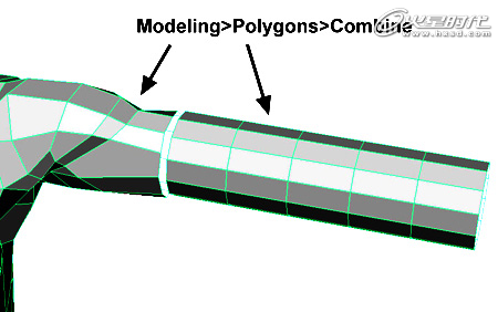 将圆柱体两边的多边形面片删除掉,然后选择身体模型和这个圆柱体模型,切换到Modeling模块,执行菜单命令Polygons->Conbine,将它们结合为一个整体,如下图。(图03)