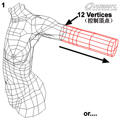 首先可以通过挤压(Extrude)的方法从身体模型上的边界机型挤压来制作手臂的大致轮廓,如下图。(图01)