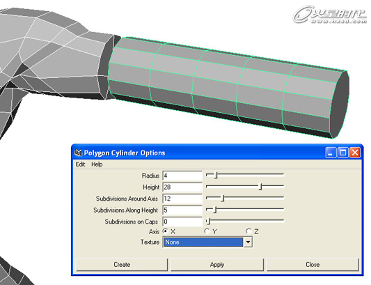 也可通过创建一个圆柱体来制作手臂模型。创建一个圆柱体,注意这里一定要保证圆柱体上有12个控制点,这个圆柱体可以直接使用创建圆柱体命令,并参照图中的设置。(图02)