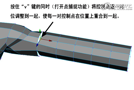使用Merge命令,将捕捉到一起的控制点逐一合并,注意上一步中捕捉到一起的控制点只是在位置上重合,至于使用Merge命令以后,才真正合并为一个控制点,结果如图。(图05)
