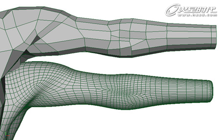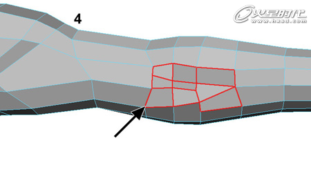 同样使用切割多边形命令,按照图中红色线条的位置进行切割,制作出手臂外侧肘根部的拓扑结构,如下图。(图08)