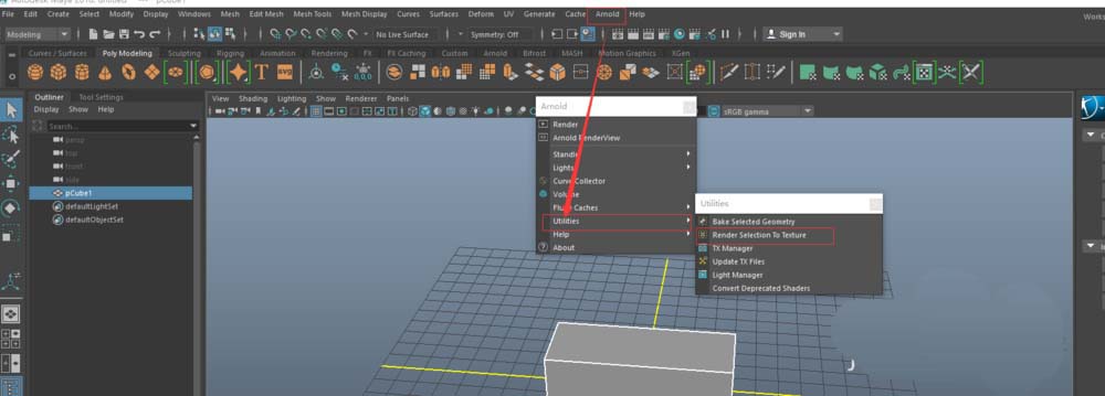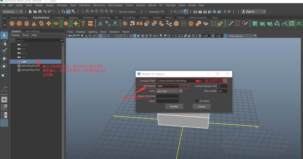 3、接下来就是要渲染了,选择Arnold__Utilities__Render Selection To Texture。在弹出框里选择保存位置和贴图的大小。注意这里没有贴图的命名,贴图名字为大纲视图中模型的命名。且命名不能与其他模型重复且不能在组内。点击选择弹出框的Render按钮开始渲染。默认格式.exr。