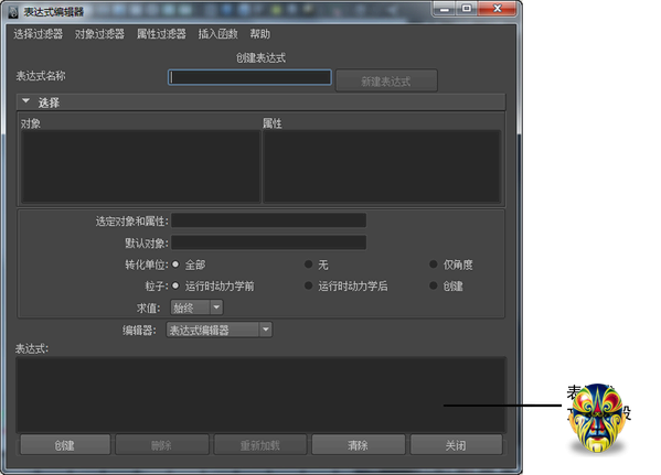 选择过滤器(Select Filter)此菜单中的各项用于控制如何选择要编辑的表达式。可以按名称、对象及其属性列出场景中的所有表达式,或者场景中的所有脚本节点。对象过滤器(Object Filter) 将"选择过滤器"(Select Filter)菜单设置为"按对象/属性名称"(By Object/Attribute Name)时,此菜单可控制哪些对象类型出现在对象列表的"选择"(Selection)下。属性过滤器(Attribute Filter) 将"选择过滤器"(Select Filter)菜单设置为"按对象/属性名称"(By Object/Attribute Name)时,可以选择显示所有属性或仅显示由表达式驱动的属性。插入函数(Insert Functions) 通过此菜单中的项,可以将有用 MEL 函数的名称插入表达式编辑框中。
