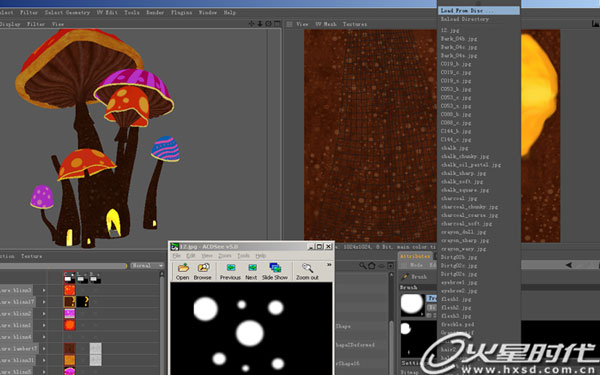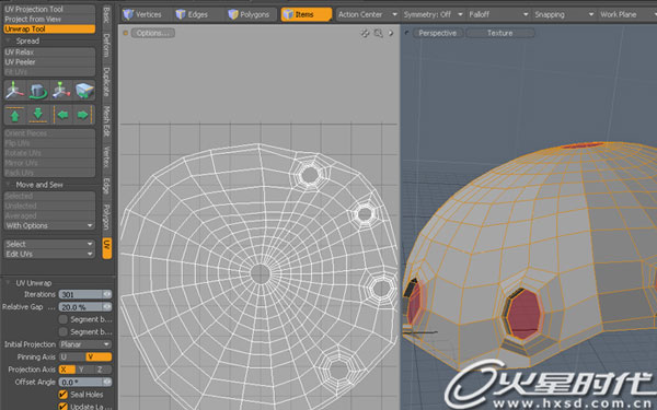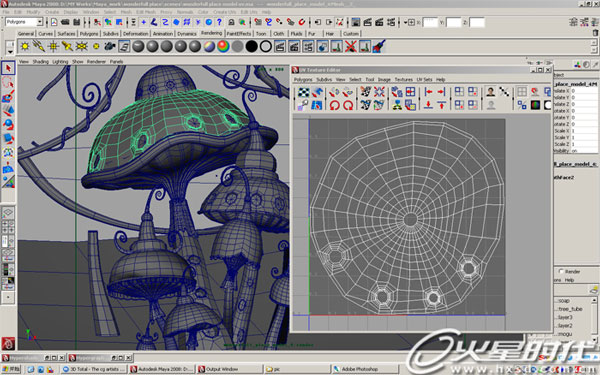 以场景中心的伞状模型为例,我先是在Maya里面用简单几何体编辑成理想的形状,然后把它导入用modo ,利用其UV 工具立刻拆分UV,这里要说的是之所以这样做,原因是因为modo的UV 工具效率高,可以避免完全在Maya里拆分UV浪费宝贵的时间。(图1)