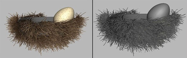 鸟巢:鸟巢是用大量不同大小的圆柱体制作的,上面有一个斜面纹理,所以设置一个正确的照明就能得到很好的效果。