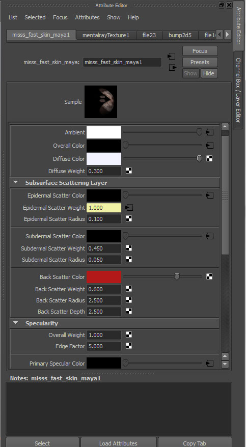 皮肤纹理我使用了4K的相机项目,然后把这些项目烘培成纹理。用这种技术能让我创建相应的4K大小的凹凸贴图。用Mental Ray的fast skin描影器来获得表面的投射效果,同时得到真实的皮肤效果(图02-03)。皮肤的风化效果我结合了两种贴图。在皮肤凹进去的部分我衔接了凹凸贴图,然后把法线贴图的凹凸阶段与凹凸贴图的阶段贴在一起。用这种方法可以保持在ZBrush中雕刻好的皱纹,还有用纹理贴图创建的凹凸(图04)。我还用mental ray的fast skin工具做了号角,以便得到空心的微妙效果。从这里开始就要调节数值以获得每一个描影中想要的效果。