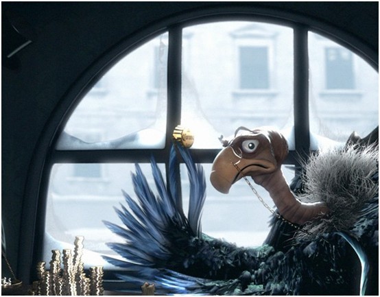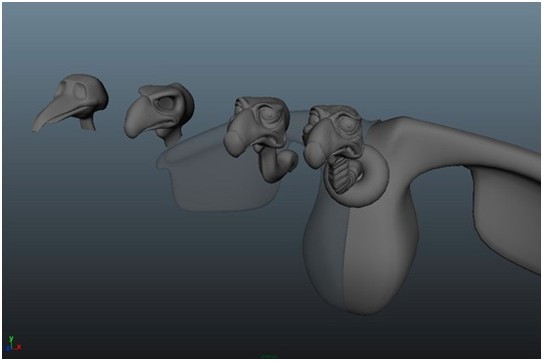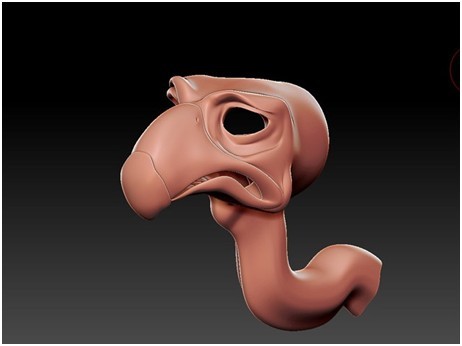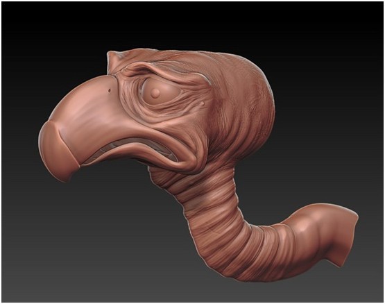 我开始以同样的方式绘制守财奴的草图:从头部。我开始在maya中画简单的形状,看上去像一只鸟的头。然后模型导入到Zbrush中开始雕刻吝啬鬼埃比尼泽初期版本,不断修改设计,直到得到令我满意的结果(如图3)。