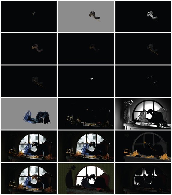 我用了一个点光转换成主区域灯光来作为现场的窗口的主灯,和许多射灯来照亮其他的点。直接照明的使用,使我们能够更快的渲染,仅仅几分钟。我喜欢在许多渲染层渲染,这样我在合成的时候可以更好的控制。我将我的渲染层分为6个不同的部分:背景,衣服,秃鹫,羽毛,书桌和其他。每个渲染层分为8 – 10个渲染灯共约70-80渲染层(图08),渲染通道。
