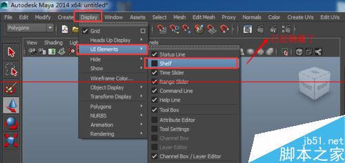 a、选择菜单display-UI Elements-shelf前面的勾去掉就可以隐藏工具架。