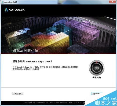maya2014属于试用软件,试用期为30天。试用期结束后就无法使用,必须激活后才能继续使用。下面教大家一种免费激活的方法。由于刚安装的软件激活方法和已试用过软件的激活方法有些出入,刚刚安装的maya2014要多出几个步骤,区别就在于第一步点击“激活”后弹出来的对话框不同,大家可以根据自己的情况对号入座。考虑到激活步骤的全面性,本激活方法按照刚刚安装过maya2014且从未运行过的情况来走。