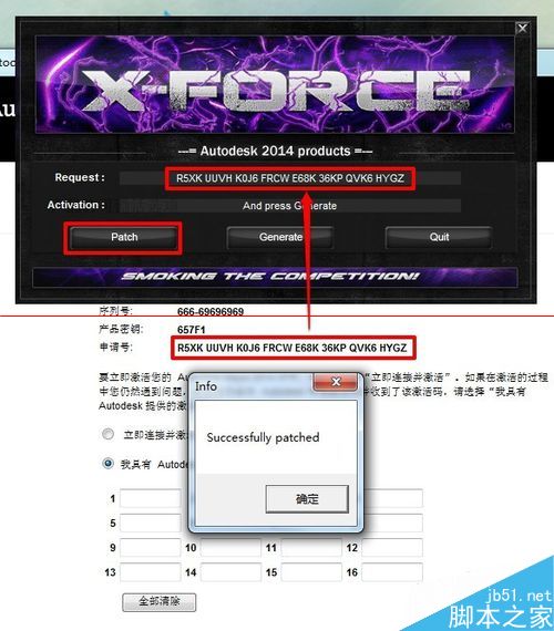 7、将maya2014激活页界面中的申请号复制到request框中,点击patch,并关掉成功提示框。注意:复制申请号的时候,无法使用鼠标右键,必须使用ctrl+c快捷键来复制。