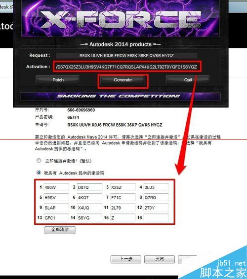 8、点击注册机中间的按钮"generate",把activation框中的激活码复制粘贴到maya2014激活码框中,点击下一步。