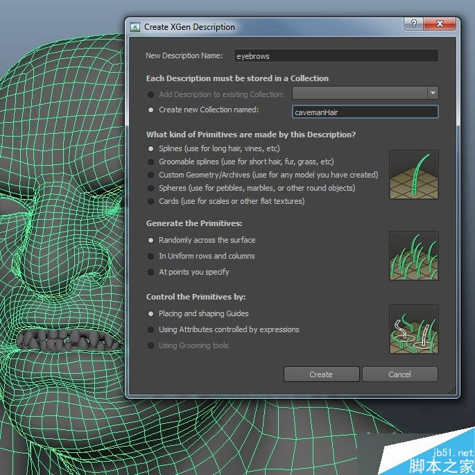 选择要创建毛发物体创建一个新的xGen description,造型控制方式我比较喜欢用"Placing and shaping Guides"(放置和调整引导线)。