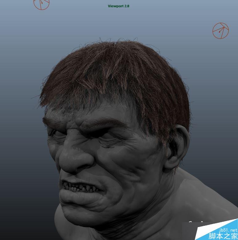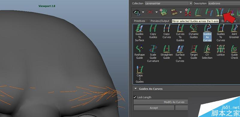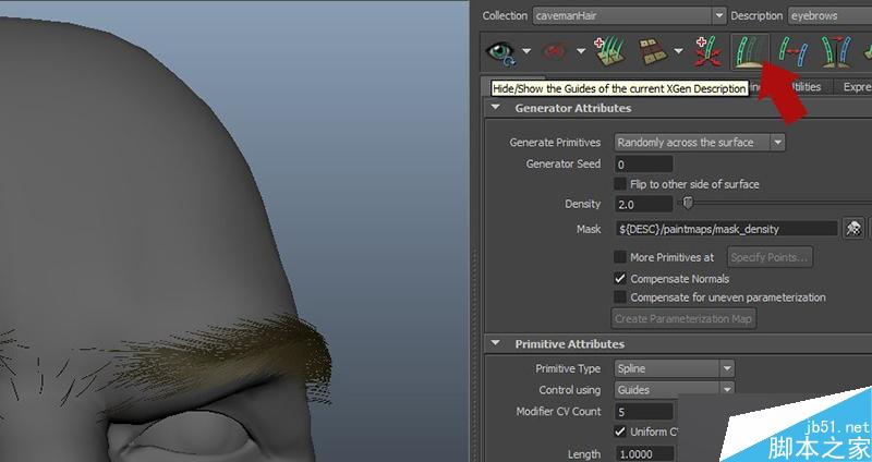 现在预览看起来并不是太好,可以看到xGen并没有为整个头部创建毛发,而是仅仅在引导线附近生成了毛发