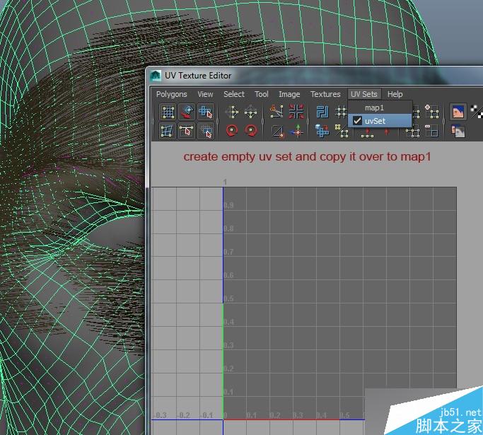 接下来我们通过绘制遮罩来控制密度,由于xGen是基于Ptex的,但是Maya的3Dpaint工具时使用UV来绘制的。这里我用了一个小窍门来得到一个新的符合Ptex的UV:创建一个新的uvSet,把他拷贝到map1,所有的uv就都消失了,然后删除新建的这个uvSet