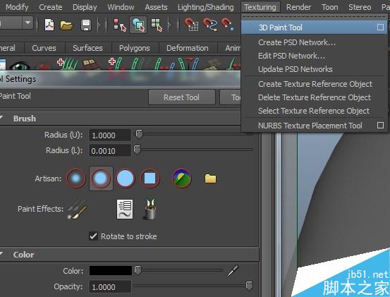 在rendering模块中,点击Texturing目录下面的3DPaint Tool后面的方块打开3DPaint工具的设置窗口