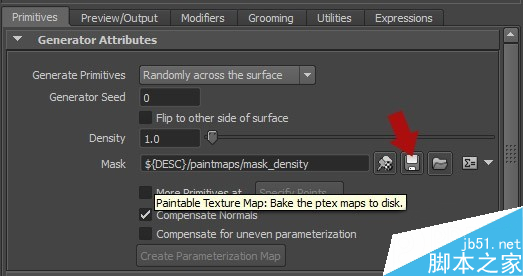 下面我们要设置Ptex贴图,在弹出的窗口中点击generate按钮来生成丛快贴图,Densily值大家根据自己的情况来设置,本例中0.2.,点击保存。
