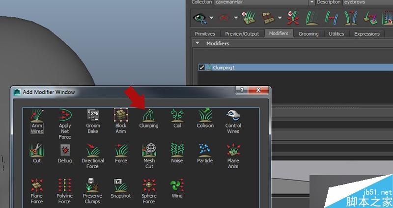 现在我们用一些修改工具来让我们的毛发更加生动,在Modifiers面板下面创建一个Clumping修改器。