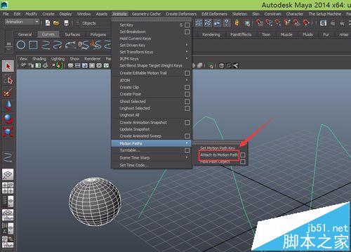 7、在视图区,先选择球体,按下键盘的SHIFT键在加选曲线,在上面的菜单区找到Animate菜单,如图所示: