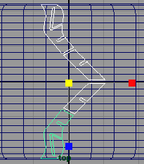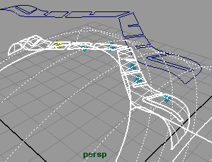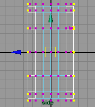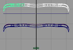 切换到侧视窗中,选择外沿的 CV 点 (fig 3) 将它们拉伸如 (fig 4). 注意 : 使用中心黄点来拉伸 .
