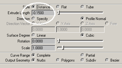 当新投影的曲线仍然被选择的时候,到 surfacesextrudeoption box , 将 style 设为 distance , extrude length 设为 -0.15. output geometry 设为 nurbs (fig 7), 设定好后点击 extrude , 我们将得到如 (fig 8) 所示