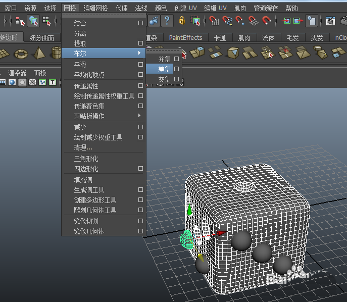 7、选择立方体模型,然后加选择球体模型,接着执行”网络>布尔>差集“(对立方体和每一个球体分别进行,需要点耐心) 结果如图