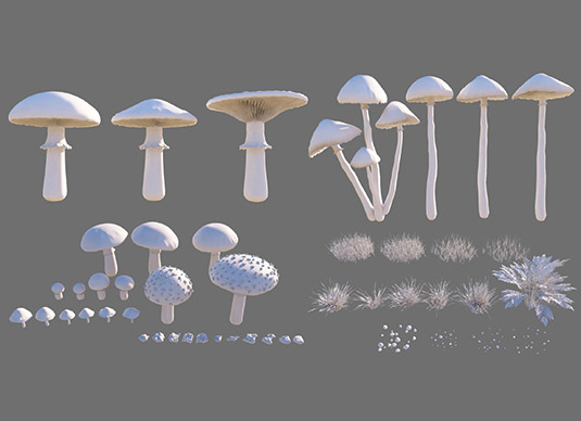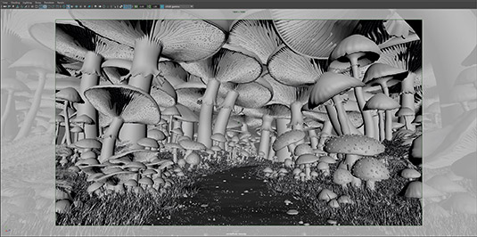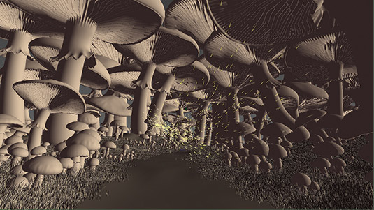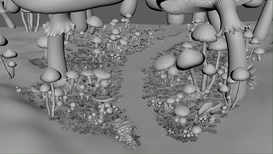 大的蘑菇在Maya中创建模型,然后在Mudbox中细化模型。导出雕刻图层作为矢量位置换贴图在mental ray中使用。较小的蘑菇的细节不是那么重要,可以用简单的几何体表达。草地模型可以由Paint Effects软件预设生成,针对不同的变化进行调整及优化。注意多边形的细分级别,这对内存要求是有很大影响的。
