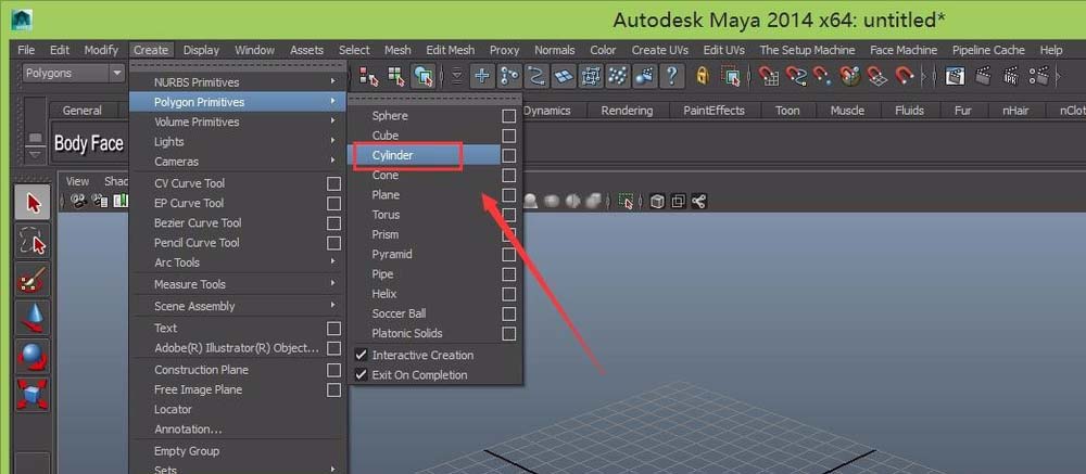 3、在这个界面的菜单区找到create选项,点击create菜单,在其子级菜单里找到polygon primitives选项,点击其下拉箭头,在其下拉菜单里找到cylinder选项,如图所示: