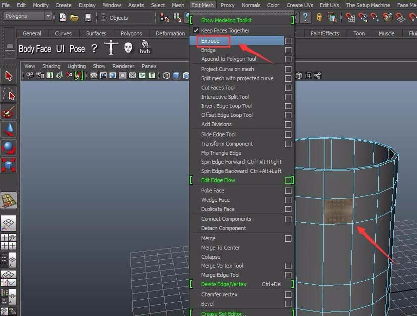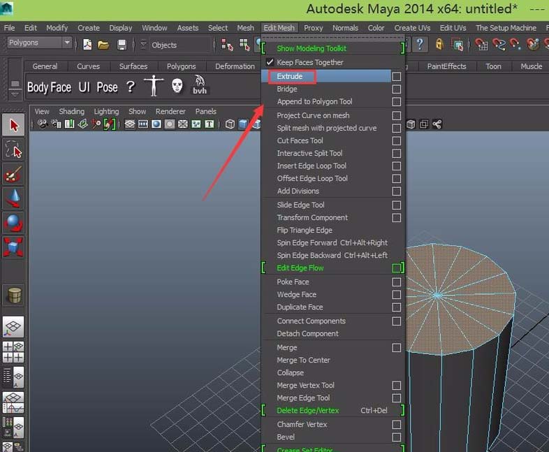 8、在上面的的菜单里找到edit mesh菜单,点击edit mesh菜单,在其下拉菜单里找到extrude选项,如图所示: