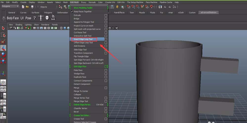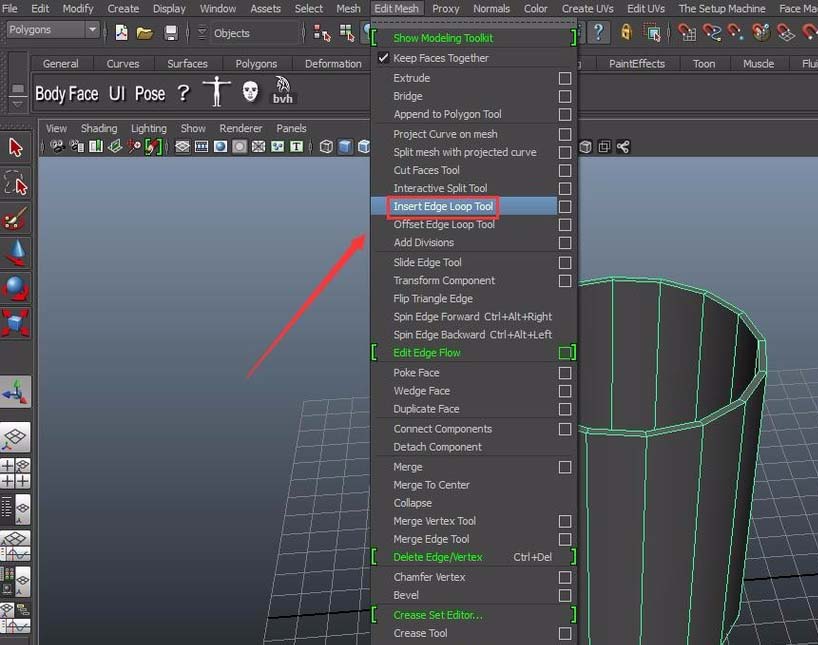 10、在上面的菜单里找到edit mesh选项,在其子级菜单里找到insert edge loop tool选项,如图所示: