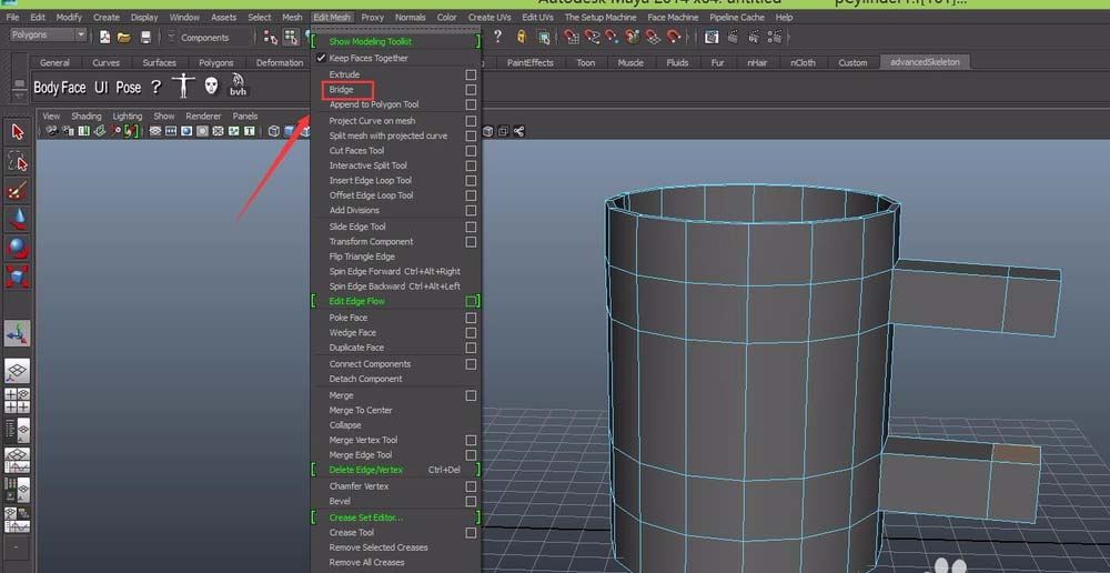 18、再在edit mesh的子级菜单里找到bridge选项,如图所示: