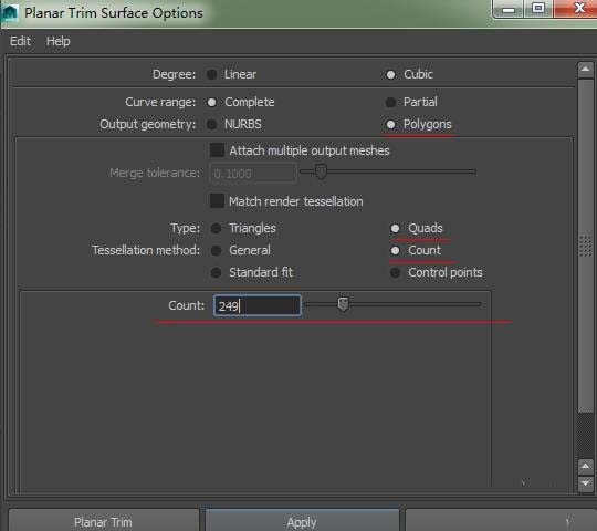 在设置窗口里面,一般而言,可以在output geometry选项中选择polygons,在type选项中选择quads(这样是四边面,当然如果需要也可以选择前面的triangles三边面),在tessellation method中选择count(计面数的方式),最后再在下面的count里面设置自己需要的面数。