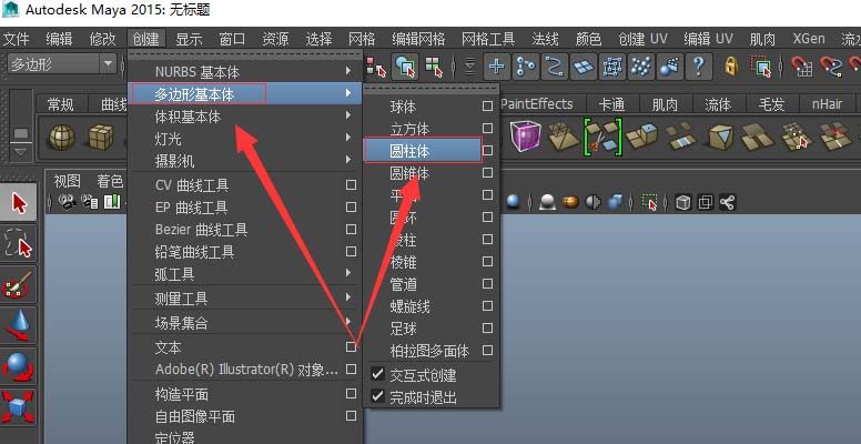 1、在菜单栏中选择“创建”按钮,在“多边形基本体”下创建“圆柱体”;