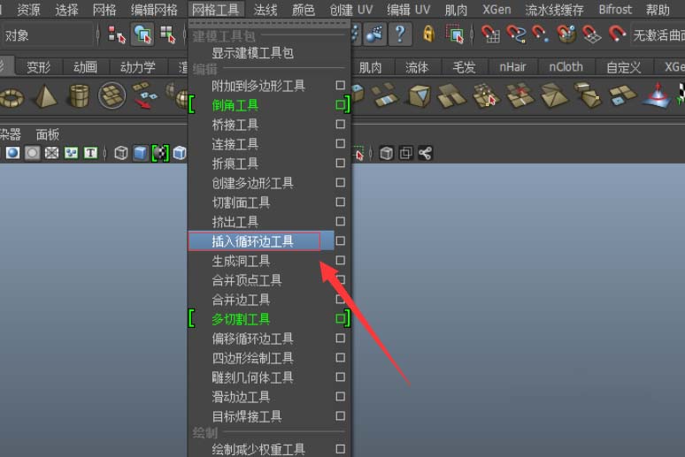 4、在选中编辑物体的情况下,选择“网格工具”菜单栏下的“插入循环边工具”;