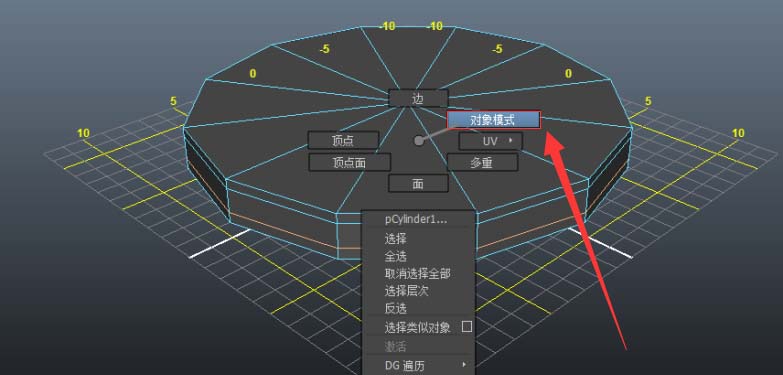 6、单击右键,将鼠标移动到“对象模式”时松开鼠标,返回对象模式;