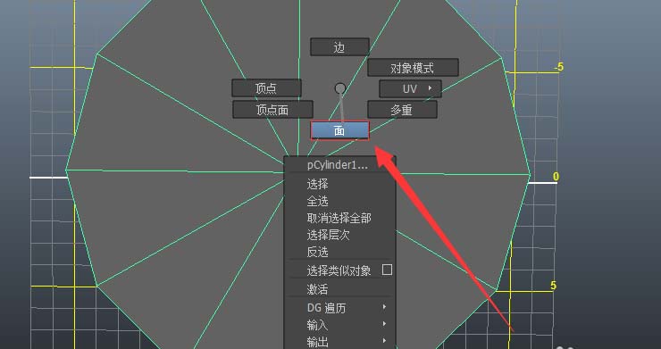 7、调整视图,将圆柱体正对屏幕,确保在进行下步框选选择时能同时选择到正反两个面,并单击右键,将鼠标移动到“面”按钮上,进入“面”子物体级别;