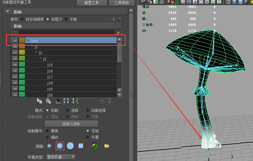 7、通过以上方法,依次选择root——j21等骨骼,绘制权重。绘制过程中多使用平滑过渡。使用添加模式时,值设置偏小;替换模式中,设置值为0