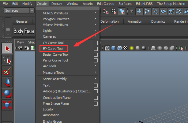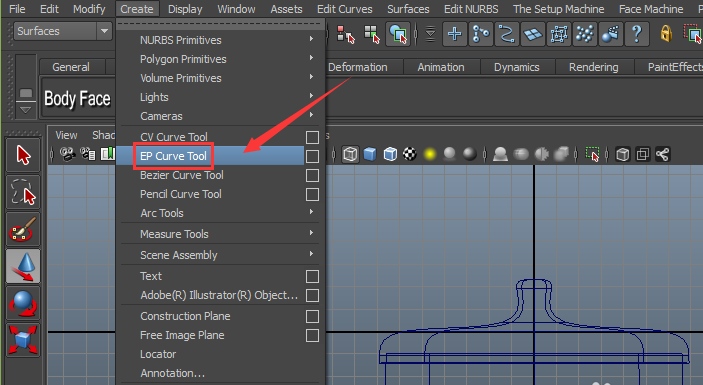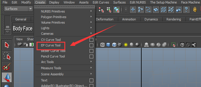 12、再在菜单里找到create菜单,在其子级菜单里找到EP curve tool命令,如图所示: