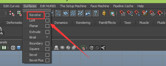 5、选择调节好的曲线,在菜单区里找到surfaces菜单,点击surfaces菜单在其子级菜单里找到revolve命令,如图所示:
